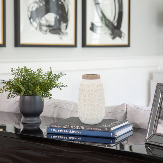 Stoneware, 13" Circle Embossed Vase, White/gold