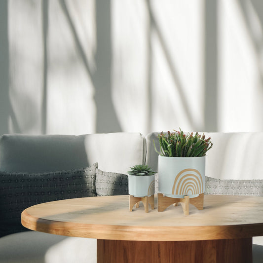 Ceramic S/2 5/8" Planter On Wooden Stand, White