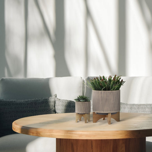 S/2 5/8" Planter W/ Wood Stand, Matte Beige