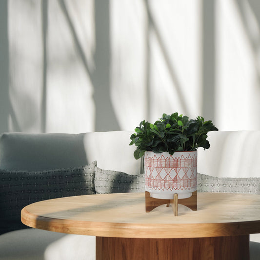 Ceramic 10" Aztec Planter On Wooden Stand, Orange