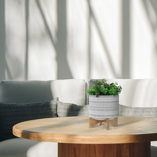 8" Tribal Planter W/ Wood Stand, White