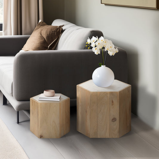 Wood/marble, S/2 14/20" Hexagonal Side Tables, Nat