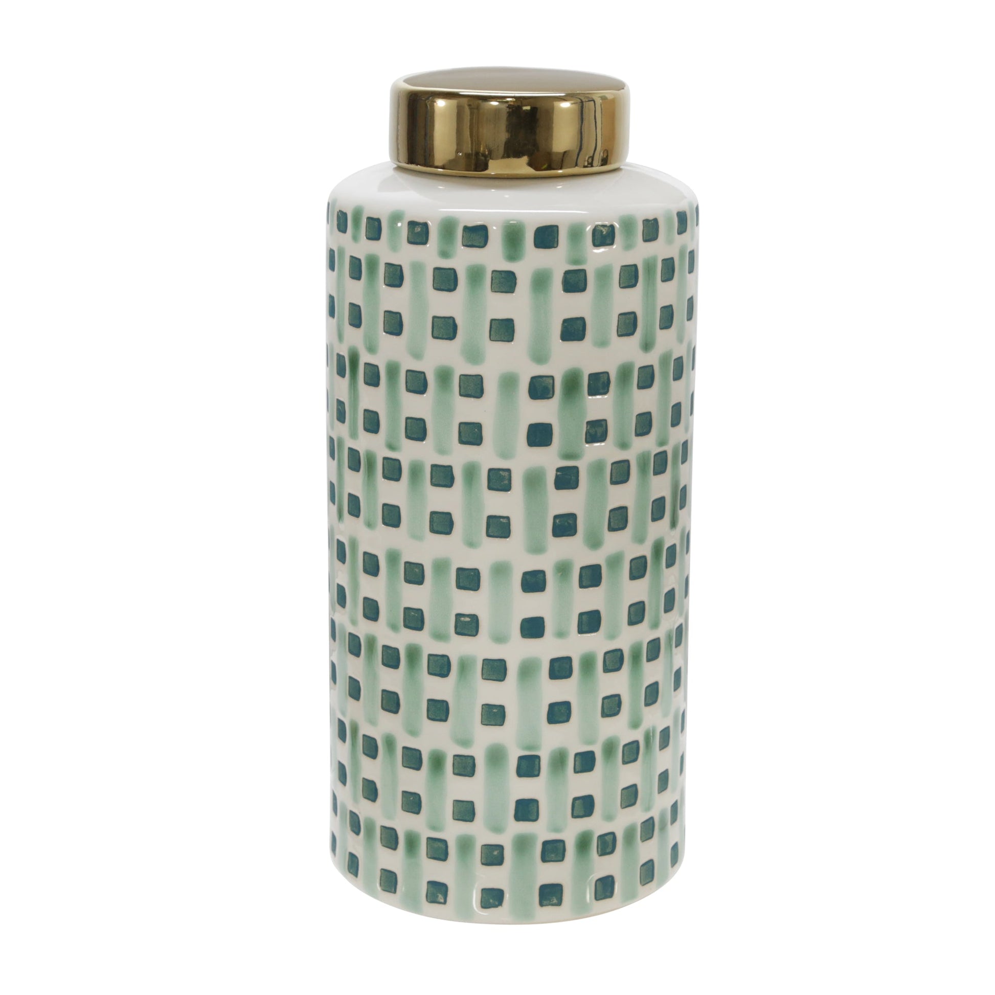Ceramic 13" Jar With Gold Lid, Green/White