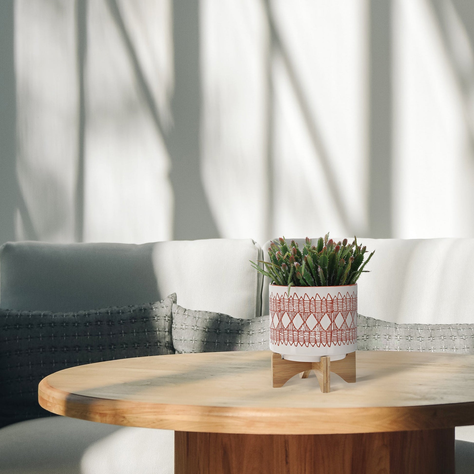 Ceramic 8" Aztec Planter On Wooden Stand, Orange