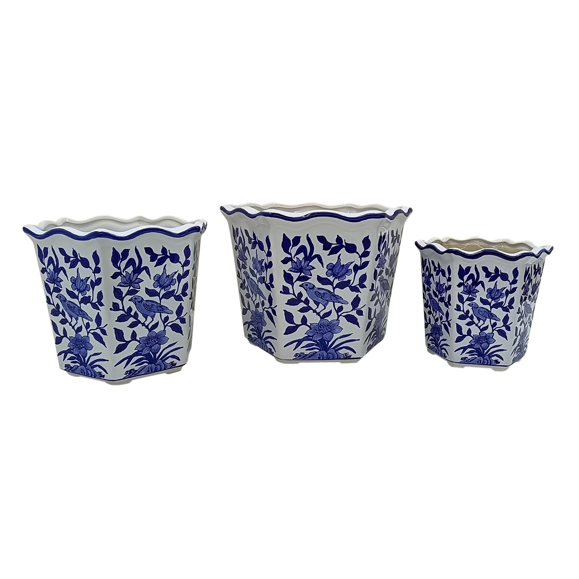 S/3 8/10/12" Chinoiserie Bird Planters, Blue/White