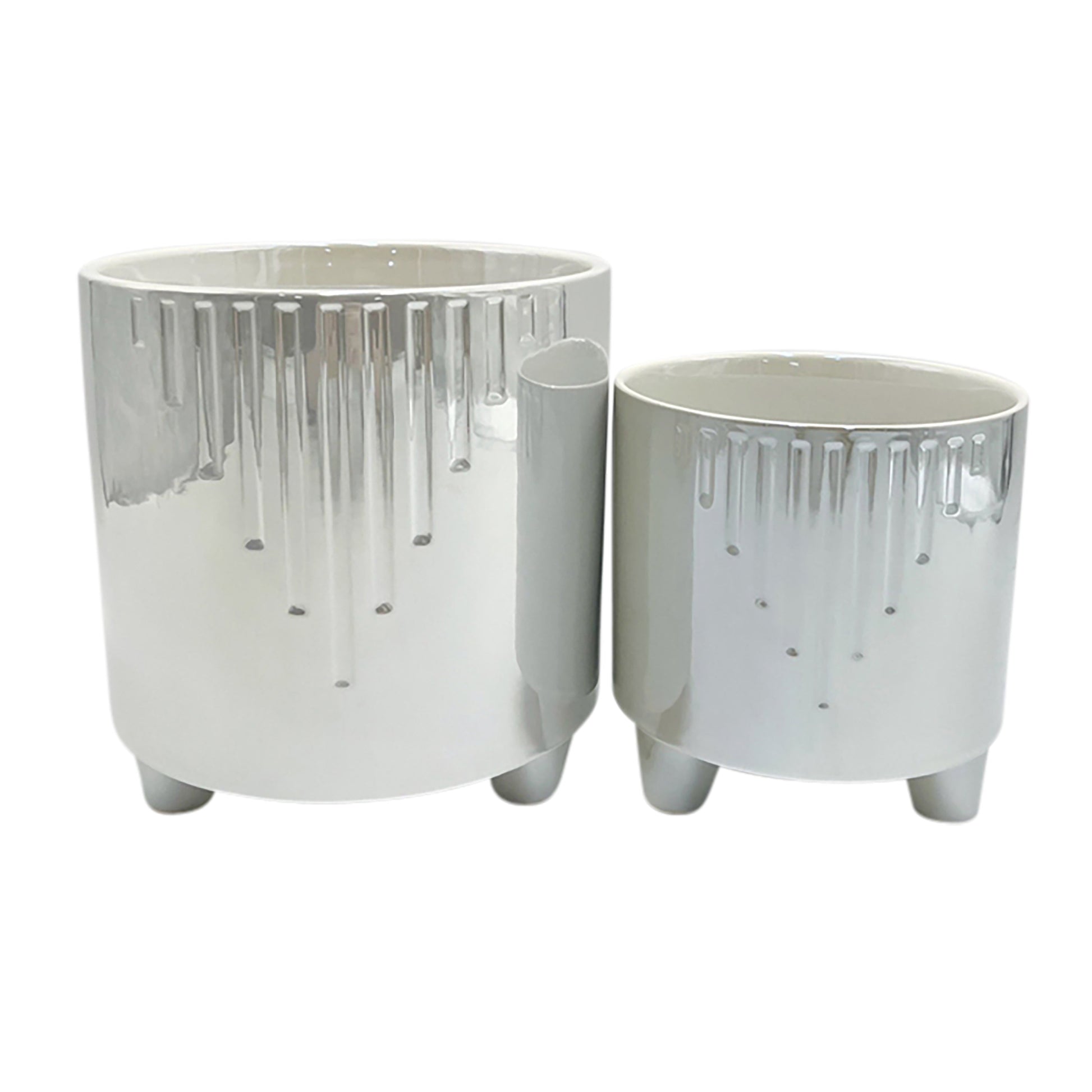 S/2 6/8" Iridescent Line Footed Planters, Ivory