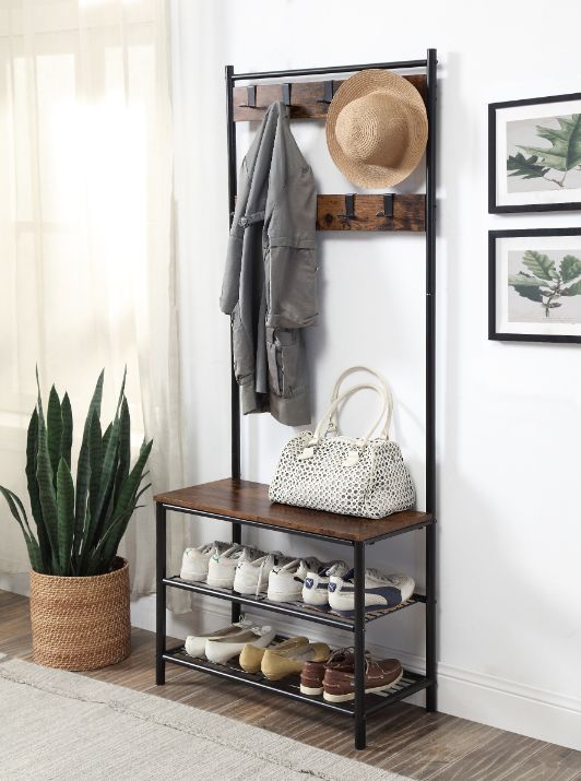 Match your clothing style and unique tastes with a stylish hall tree. The Taurus Hall Tree uses metal and wood to create an industrial look and modern feel. Metal open frame is designed with three-shelving system and nine metal hooks to give instant access to any of your shoes or clothes. Metal mesh shelving adds depth and dimension, making a beautiful contrast to the natural textures of the wood tabletop. Let this versatile hall tree add a dose of personality to your mudroom or entryway while serving a practical function.